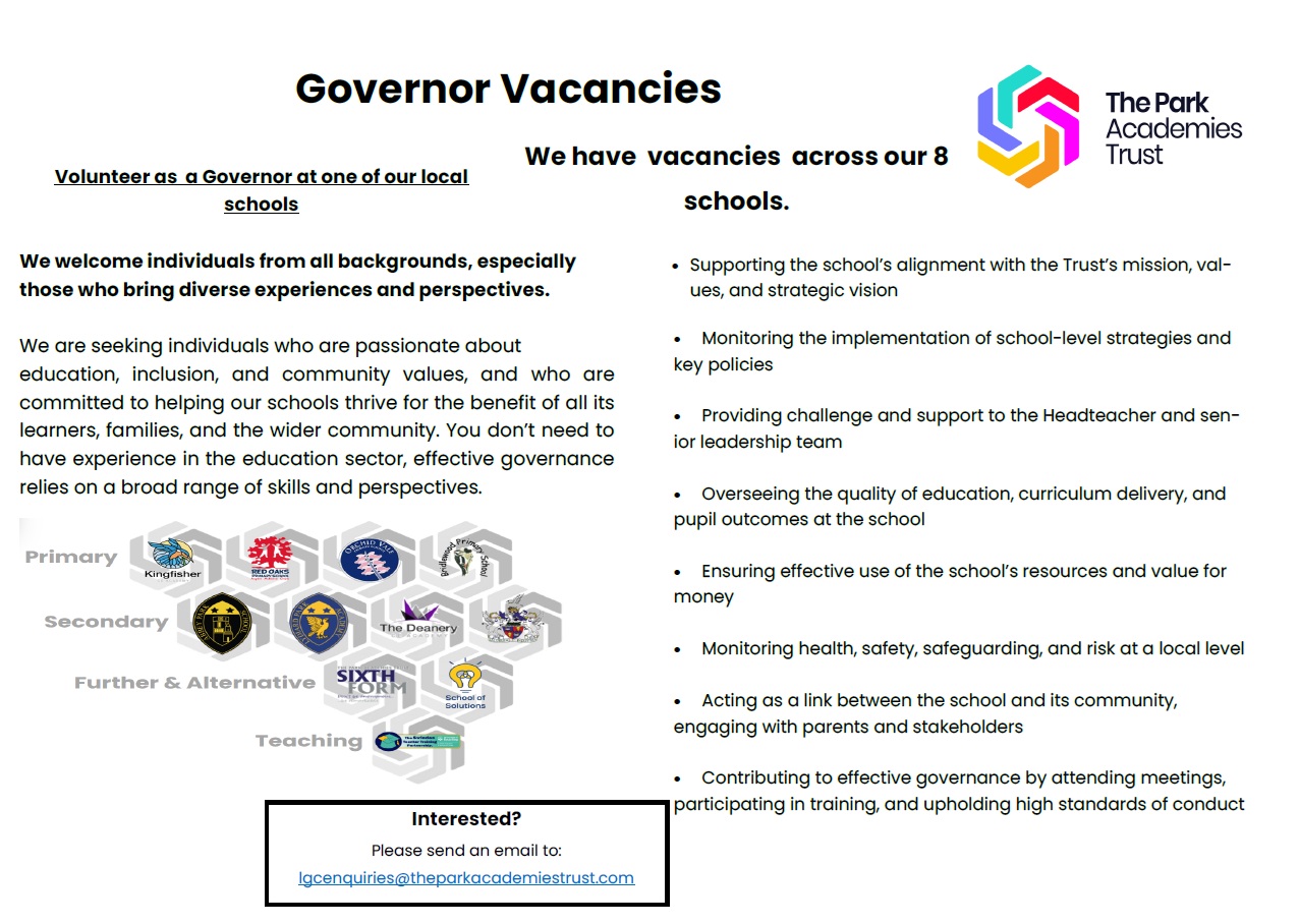Since joining The Park Academies Trust (TPAT), governance at Kingfisher CE Academy has been led by a Trust Interim Board (TIB). The TIB is a committee of the main Board of the Trust and is accountable to the TPAT Trustees for its decisions.